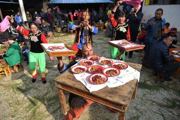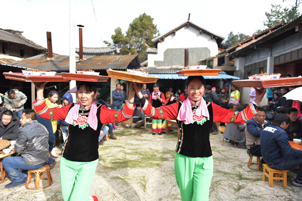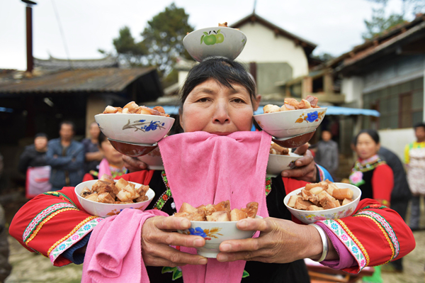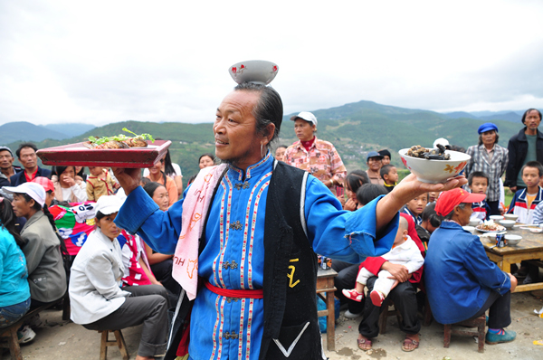 在当地村寨,举行喜庆、婚礼、丧事等活动之时,“跳菜”必不可少。逢喜事,以“跳菜”助兴;遇丧事,以“跳菜”化悲。无论哪家办事,村里的男子汉都要剃光头发,亲自下厨,舞着托盘,跳着上菜。引菜人和抬菜人从厨房到餐桌,合着音乐的节拍,跳着彝族特有的舞步,诙谐幽默地按“棋子”的布局摆菜。常见的“跳菜”有两类:“宴席跳菜”和“舞台跳菜”。