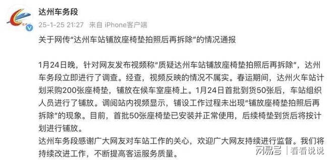 原来,为了让旅客在春运期间能有更舒适的候车体验,达州火车站计划采购200张座椅垫铺放在候车室座椅上。1月24日,首批到货的50张座椅垫抵达车站,工作人员随即组织铺设。从监控视频来看,整个铺设过程有序进行,根本不存在“铺放座椅垫拍照后再拆除”的情况。目前,这首批50张座椅垫已安装到位并正常使用,后续到货的椅垫也将按计划铺设。
